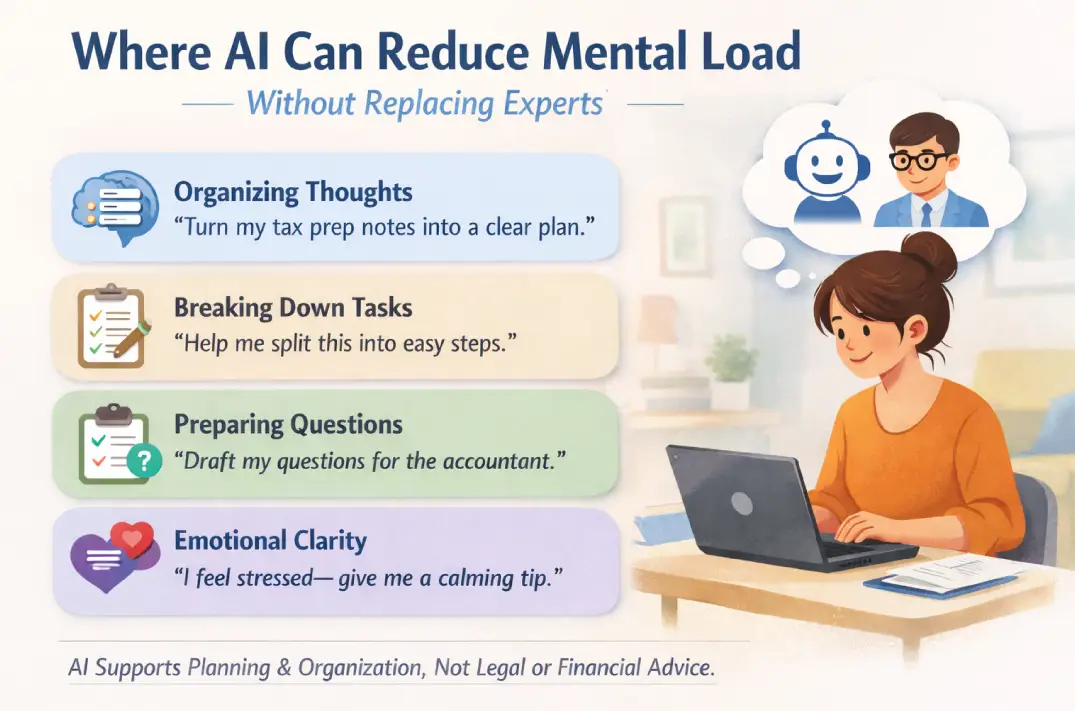 When tasks are broken into smaller steps and responsibilities become more visible, the pressure naturally starts to ease. AI can play a supportive role here, helping you organize thoughts, plan, and communicate more clearly, but it works best alongside human decisions, shared conversations, and trusted professional advice.