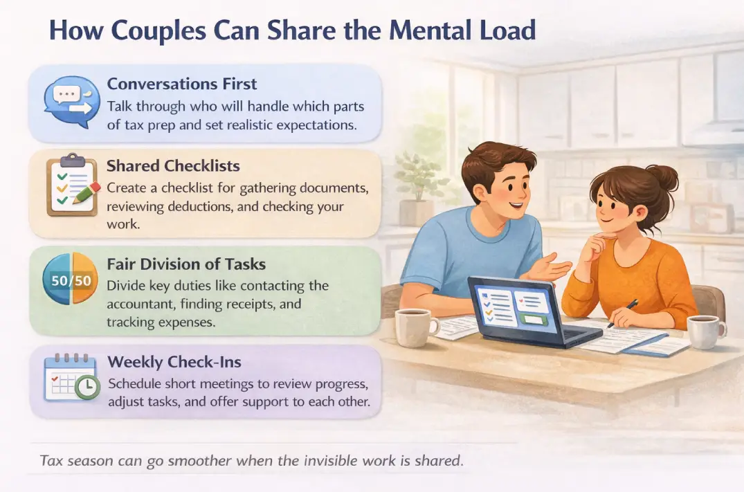 Tax season doesn’t have to feel like a silent, exhausting responsibility that one person carries alone. Often, the real challenge isn’t the filing itself, it’s the constant thinking, remembering, and coordinating that happens behind the scenes. Recognizing this mental load is the first step toward changing how tax preparation feels.